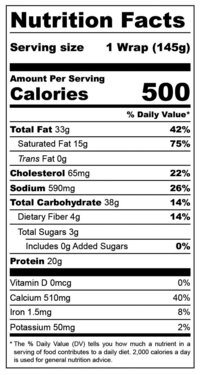 Wrap (Kathi Roll): Durum Wheat Flour, Water, Soybean Oil, Salt