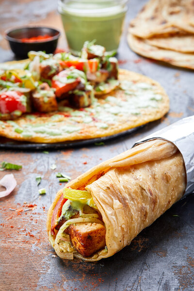 Flavorful, smoky cubes of grilled paneer, crunchy vegetables, and zesty chutneys wrapped in a warm and flaky paratha